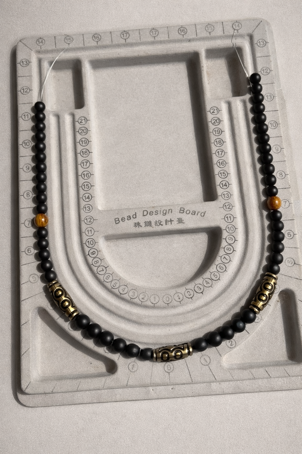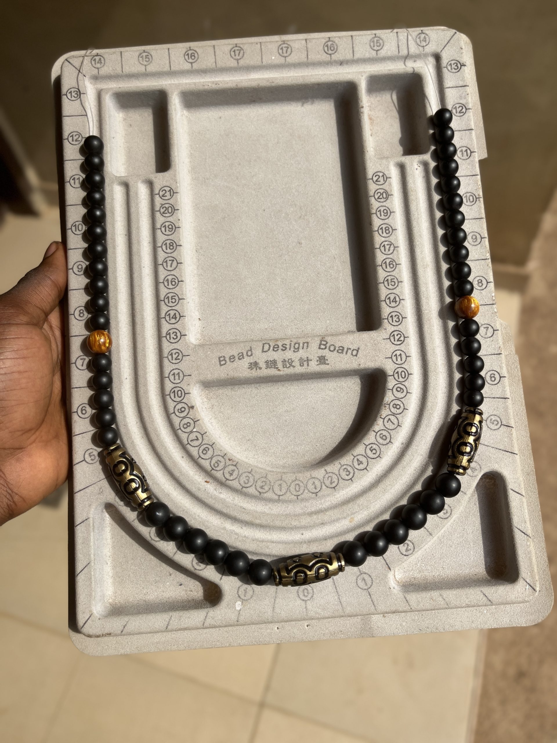 This make is made of black pearl, bronze spray divider and golden light gem. fastened with hook and clamp. Total length ≈ 23.5 inches